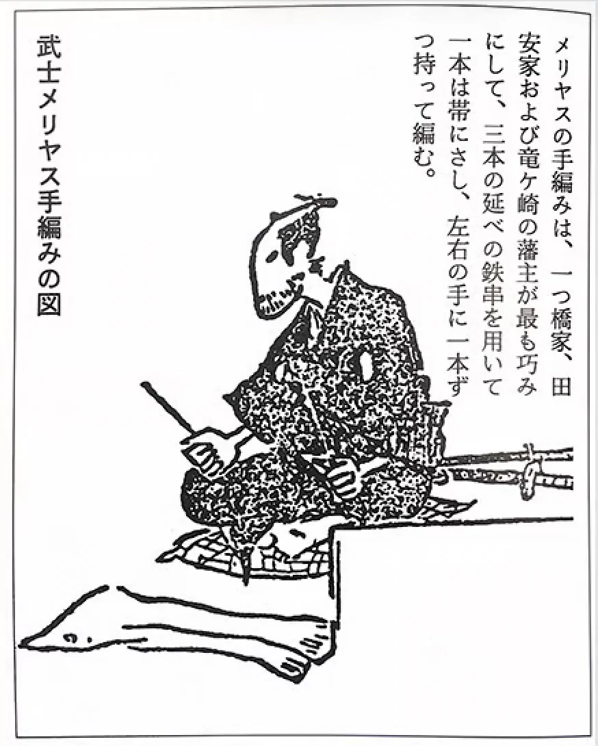 Which means knitting couldn’t have come to Japan until the Europeans showed up. In this case the Portuguese. And we know that it was the Portuguese who introduced knitting because while the current word 編み物 (amimono) is now used to describe knitting by hand, an older Japanese word for knitting and for knitwear was メリヤス (meriyasu) written in katakana, which indicates a foreign origin, and comes from the Portuguese word for stocking, meias. And there is no record of knitting in Japan prior to the arrival of the Portuguese in 1543.